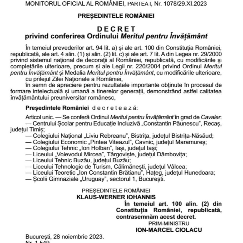 „Ne mândrim că am fost selectați să primim această înaltă distincție și suntem hotărâți să continuăm să oferim elevilor noștri o educație de calitate, axată pe inovație și adaptabilitatea la cerințele societății moderne. Mulțumim Președintelui României, domnul Klaus Johannis, pentru recunoașterea eforturilor noastre și pentru aprecierea adusă contribuției noastre la dezvoltarea educației în România.